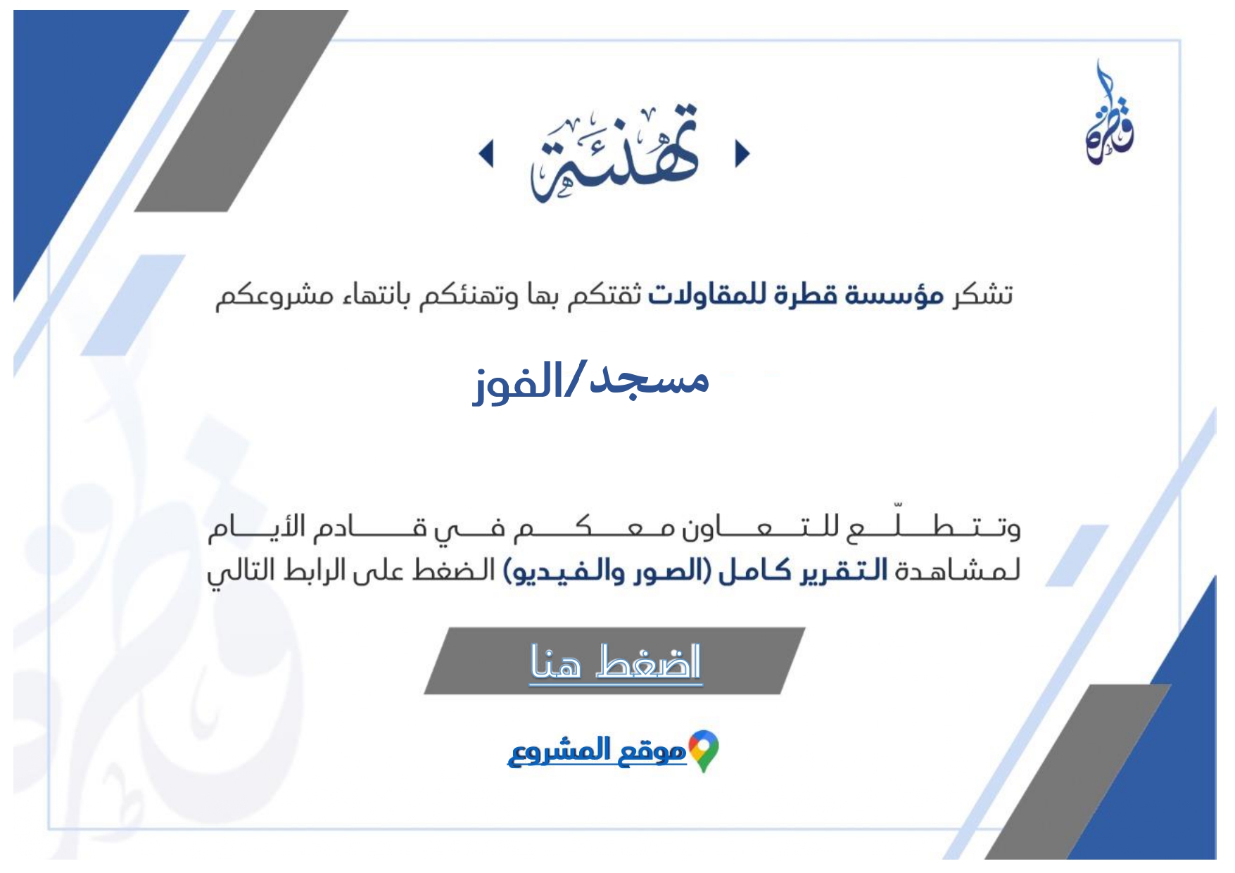 هل تخيلت يومًا أن يكون لك بئر يسقي العطشى لسنوات طويلة، أو مسجدٌ يُرفع فيه الأذان ويصلي فيه العابدون يوميًا، وكل هذا في ميزان حسناتك؟ مع قطرة للمقاولات العامة، نجعل هذه الأحلام حقيقة. نحن فريق متخصص في حفر الآبار وبناء المساجد، نعمل بسرعة وإتقان، ونضمن لك تنفيذًا موثوقًا بشهادات رسمية وتقارير موثقة. كن جزءًا من رحلة الخير اليوم، وساهم في تغيير حياة أناس لا تعرفهم، لكن دعواتهم ستصل إليك كل يوم